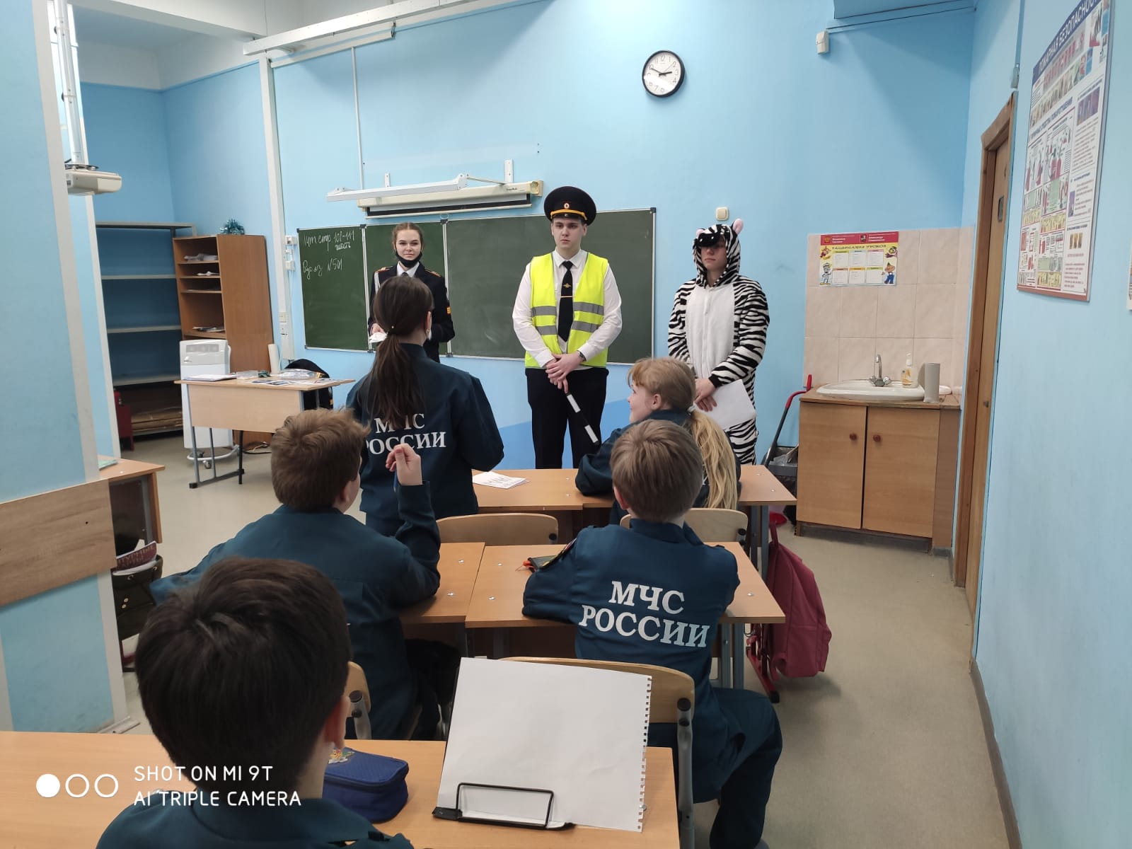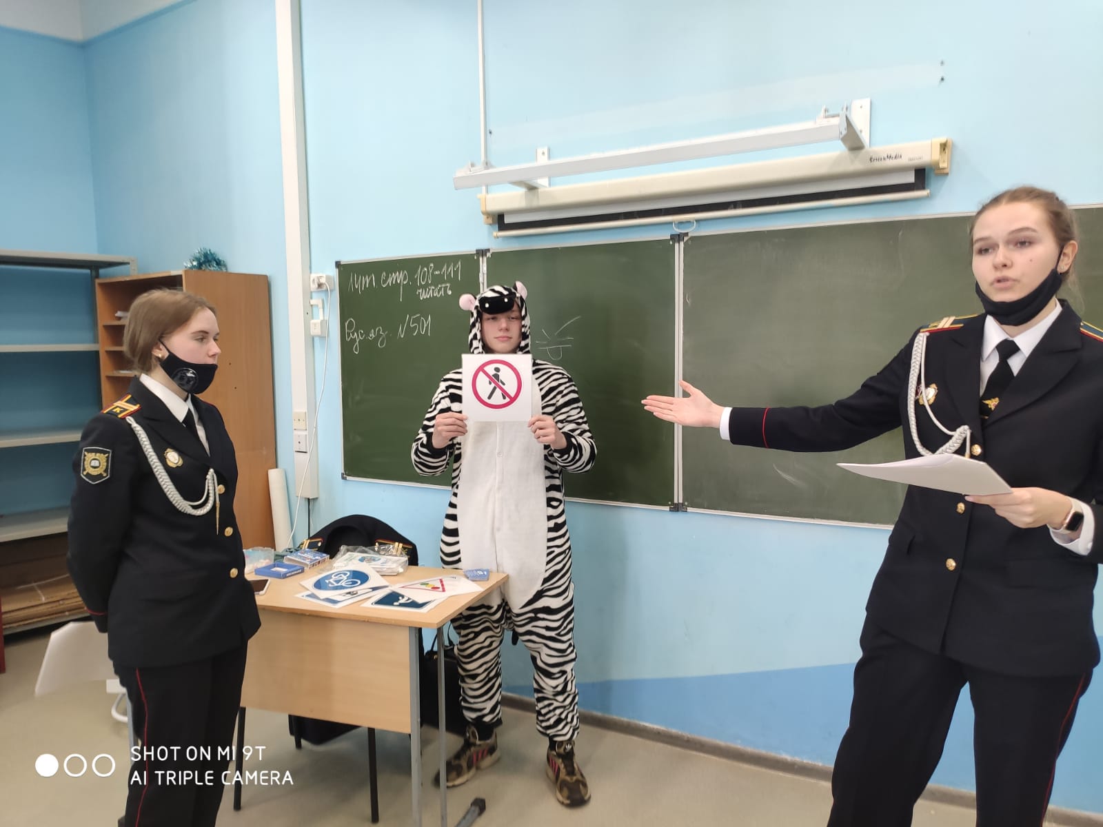 28 февраля, в последний день зимы, в гости к воспитанникам 5К кадетского класса ГБОУ «Школа №1945» пришли необычные гости. Две девушки - Костюк Елизавета, Козлова Анна и двое юношей Цыбулин Вячеслав, Гинятулин Данила. Наши гости с первых же секунд захватили внимание учеников. Прежде всего – формой одежды. Трое из четверых были одеты в парадную форму полиции, а Вячеслав в яркий и неожиданный костюм зебры.