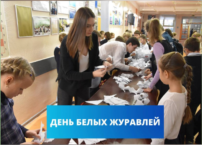 19 октября состоялся флешмоб «День Белых Журавлей». Ребята делали фигурки журавликов из бумаги, подписывали словами добра и мира и крепили на стеклянную стену.