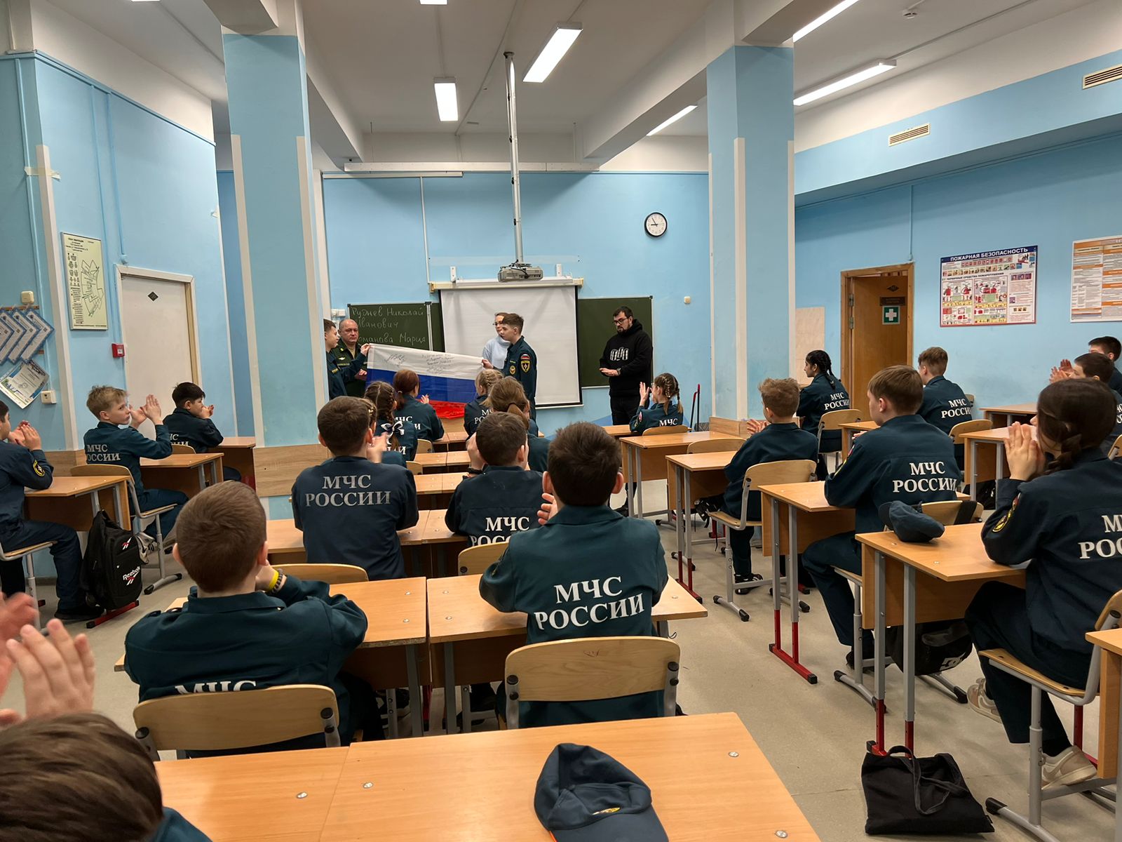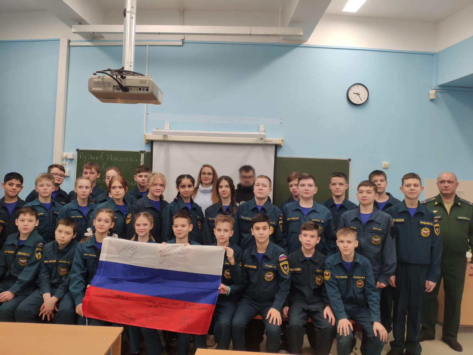13 февраля к нам в гости прибыли волонтер Мария Романова и военнослужащий Николай Руднев. Они торжественно вручили классу подарок – Флаг России, подписанный бойцами нашей армии! Согласно правил, на государственных символах не размещаются надписи и иные изображения, не предусмотренные законодательством РФ. Но в данном случае не можно, а нужно отойти от правил. Наши солдаты повторили действия своих дедов, которые рукописно подписывали флаги своей страны и водружали их над святынями поверженных врагов в годы Великой Отечественной войны! От таких надписей флаг не проигрывает, а выигрывает, обретая конкретное лицо и конкретные имена.