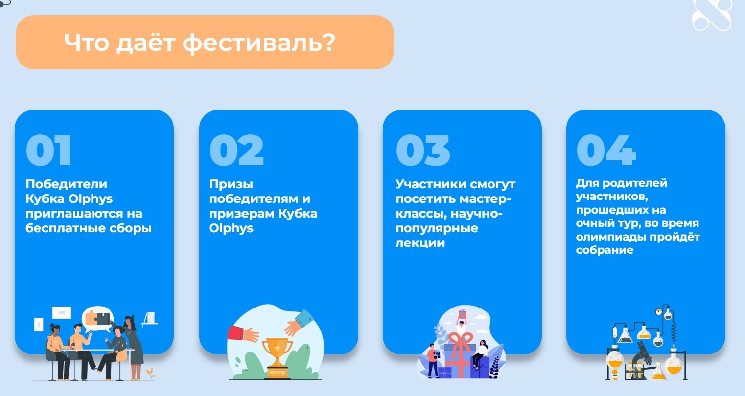 На фестивале участников ожидают научно-популярные лекции, мастер-классы и физические опыты, награждение, а также пройдет очный тур кубка Olphys. Для родителей будет проведено собрание на тему "Выявление и развитие талантов школьников" во время фестиваля.