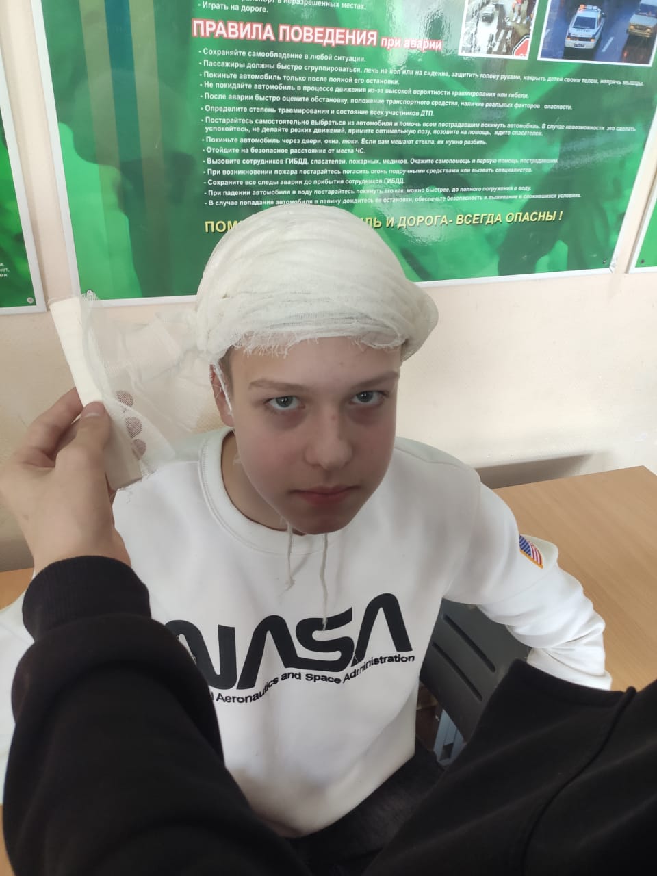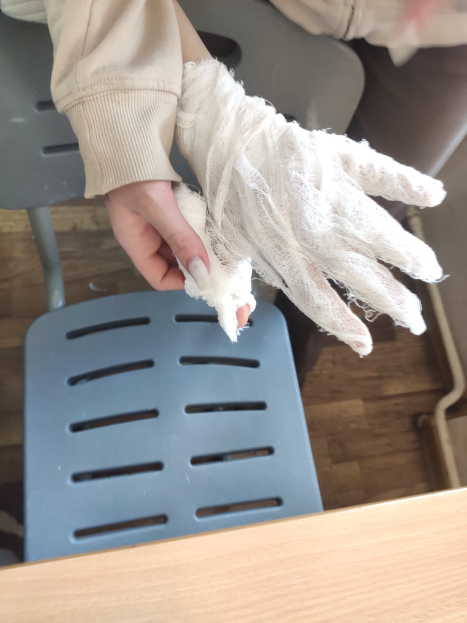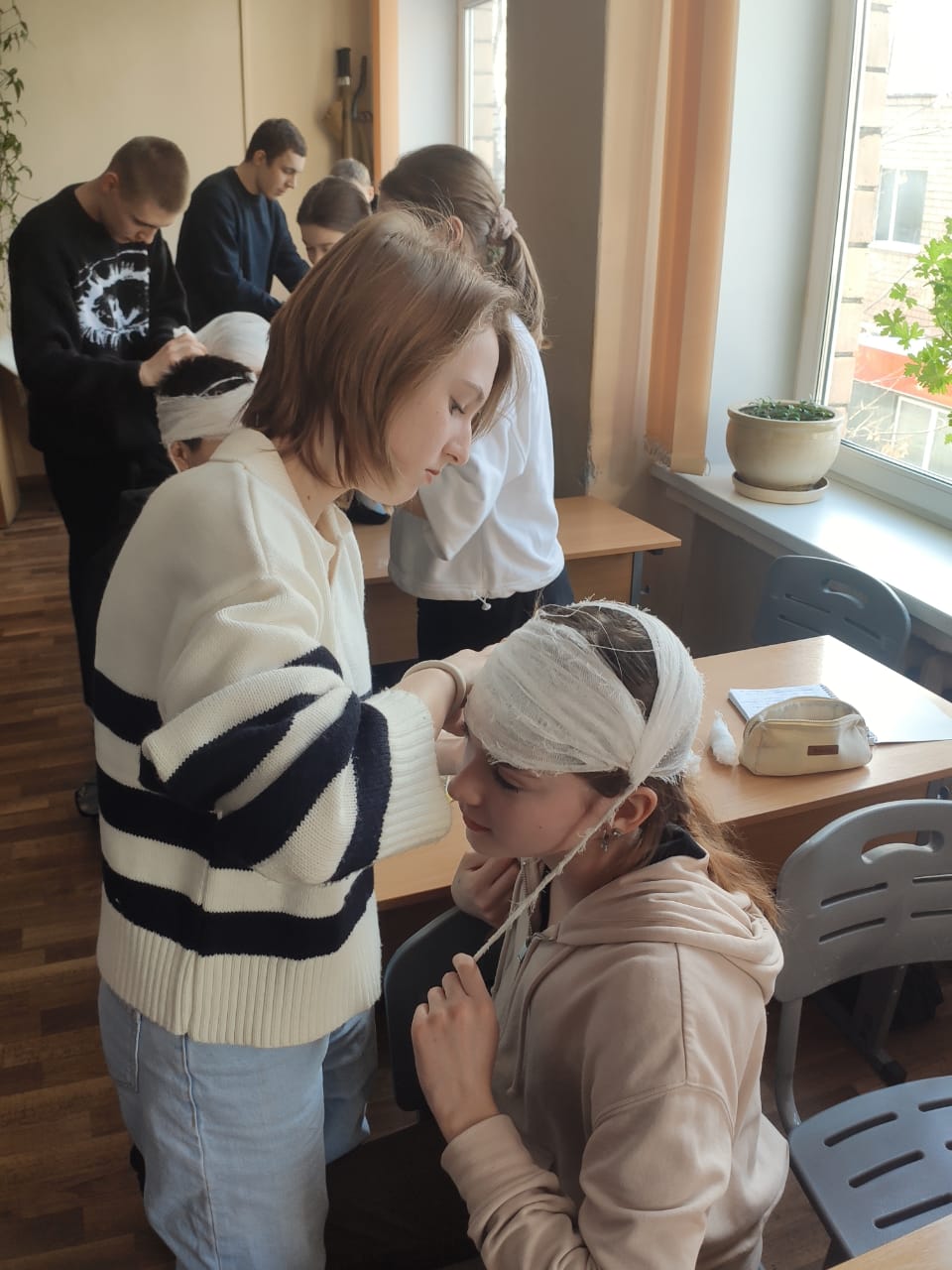 А ещё мы научились накладывать бинтовые повязки. "Это не премудрость" - скажет кто-то и будет не прав. Премудрость, да ещё какая. Вы, например, можете наложить повязку на ладонь, которая называется "перчатка"? А "варежку"? А кто может похвастаться умением наложения повязки "шапка летчика"? Видеть и уметь накладывать это разные вещи.