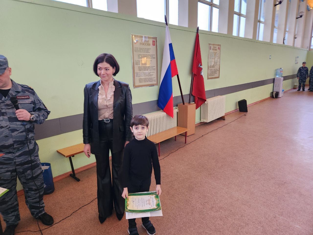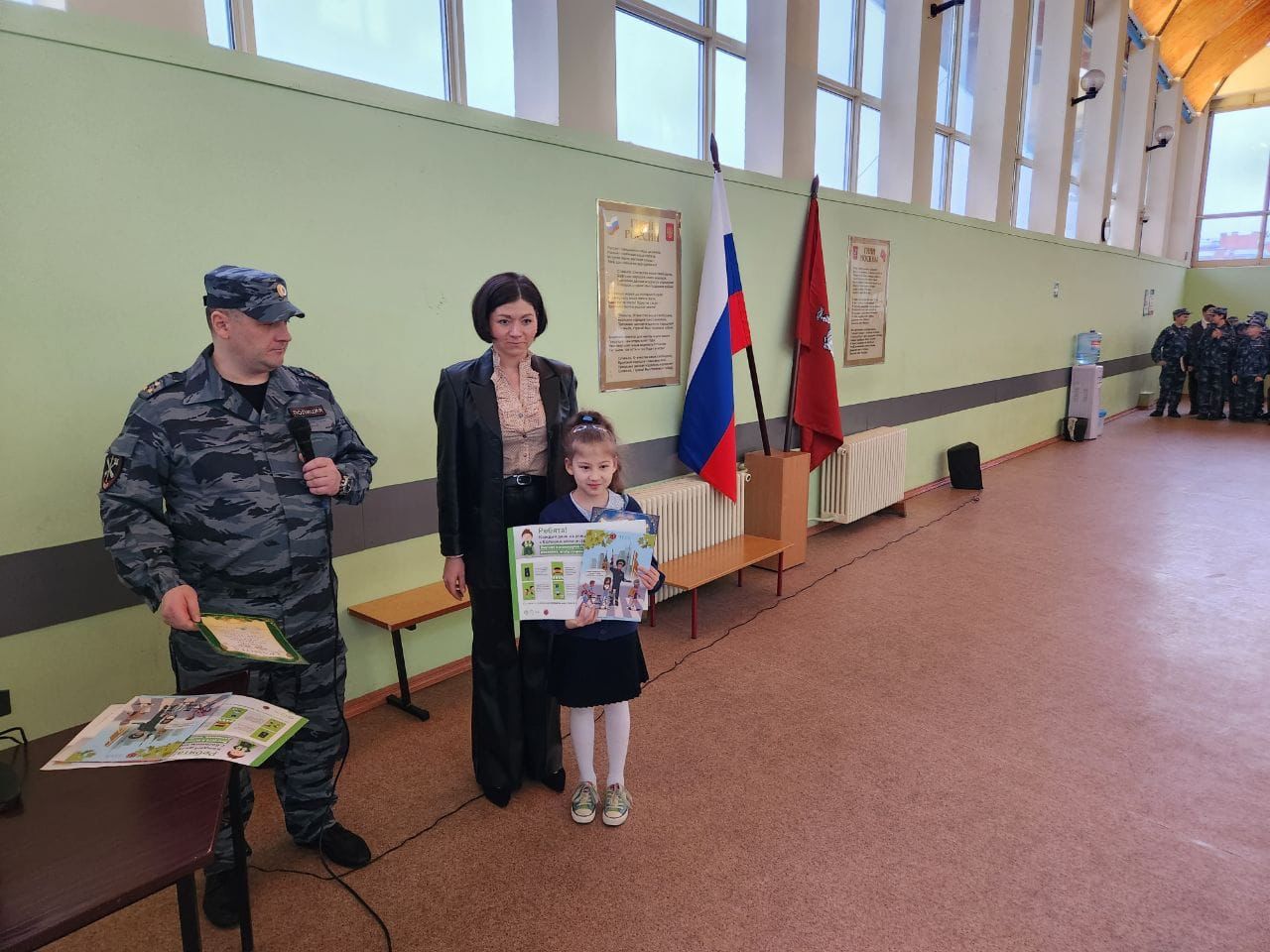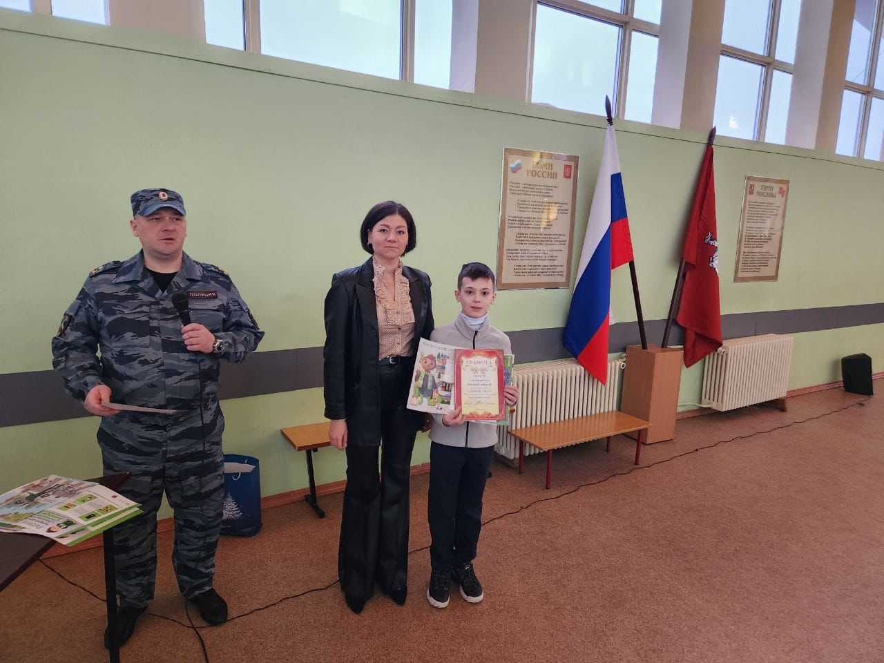 Ребята постарались все, но особенно были на высоте рисунки Михаила из 4 «У» (1 место), Алёны из 3 «Б» (2 место), Артура из 1 «В» (3 место) и Полины из 2 «Б» (4 место). В связи с чем, 5 февраля на Торжественной церемонии поднятия Государственного флага Российской Федерации победители в конкурсе были награждены Директором Школы Почетными грамотами, а также подарками по тематике изучения Правил дорожного движения, переданными сотрудниками ОБ ДПС ОГИБДД УВД по ЮЗАО ГУ МВД России по г. Москве.