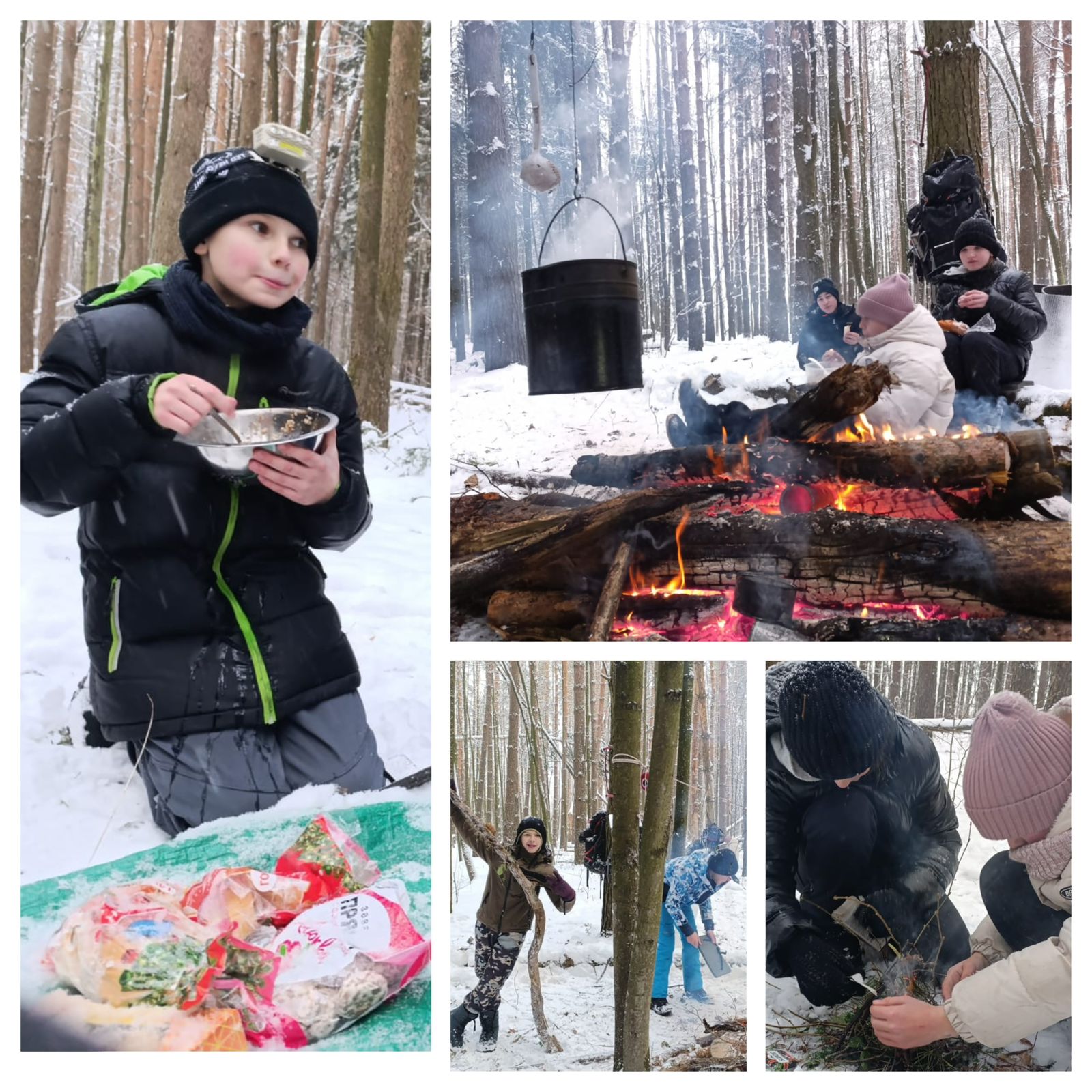 На обед – вкуснейшая гречка с тушенкой, сладкий, дымный чай с печеньками. Ребята поработали над розжигом костров в зимнем лесу в группах. Увы, навык этот требует дальнейшей проработки. Уже в январе планируются лыжные походы, а также большой выезд на февральских каникулах в соседние регионы.