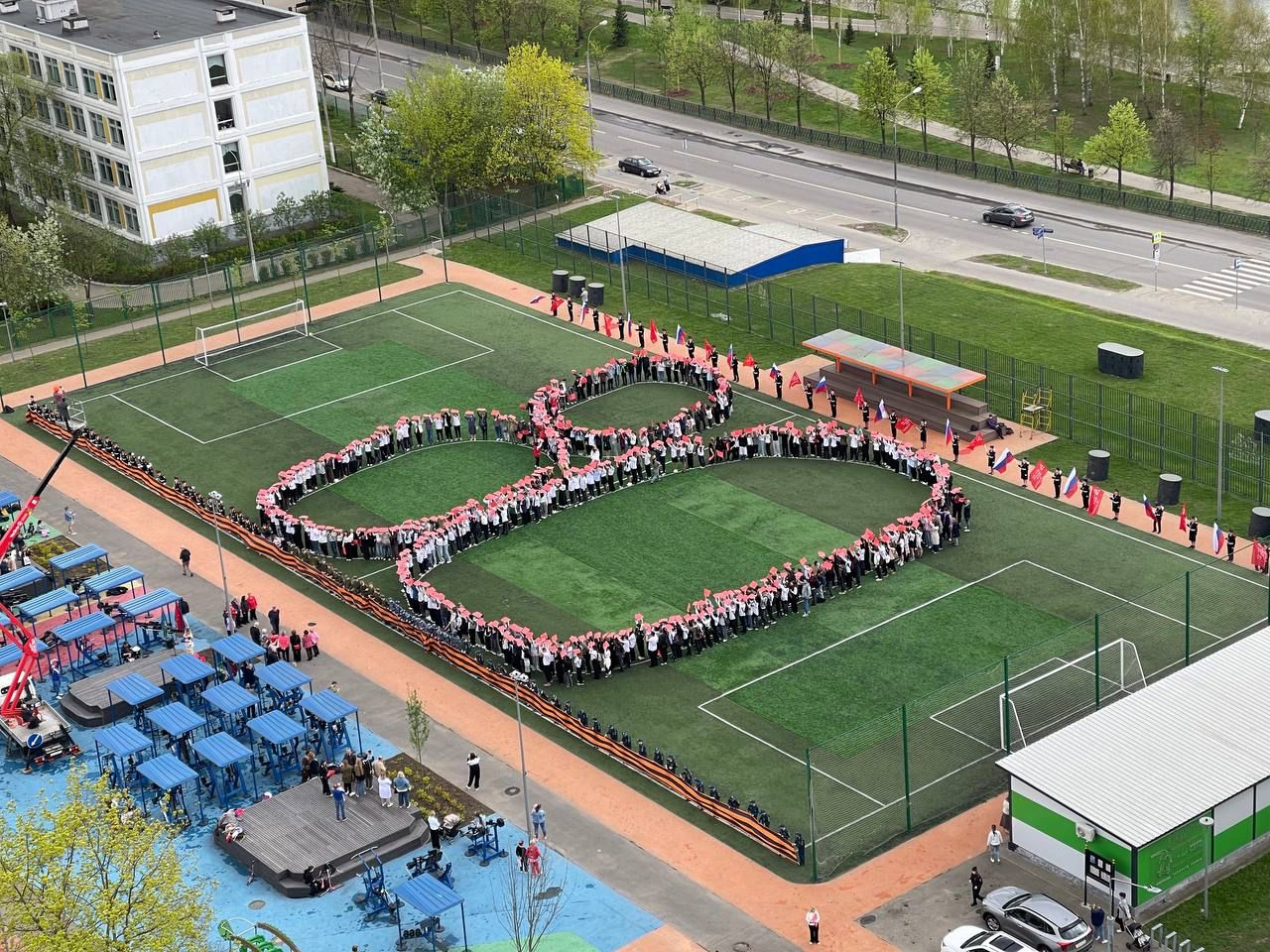 Все школы района «Северное Бутово» прислали своих школьников для участия в акции. От нашей школы участие приняли ученики кадетских и предкадетских классов. По задумке организаторов участники флешмоба должны были построить на поле стадиона цифры 8 и 0, а также обрамить их георгиевской лентой и флагами России и Победы.