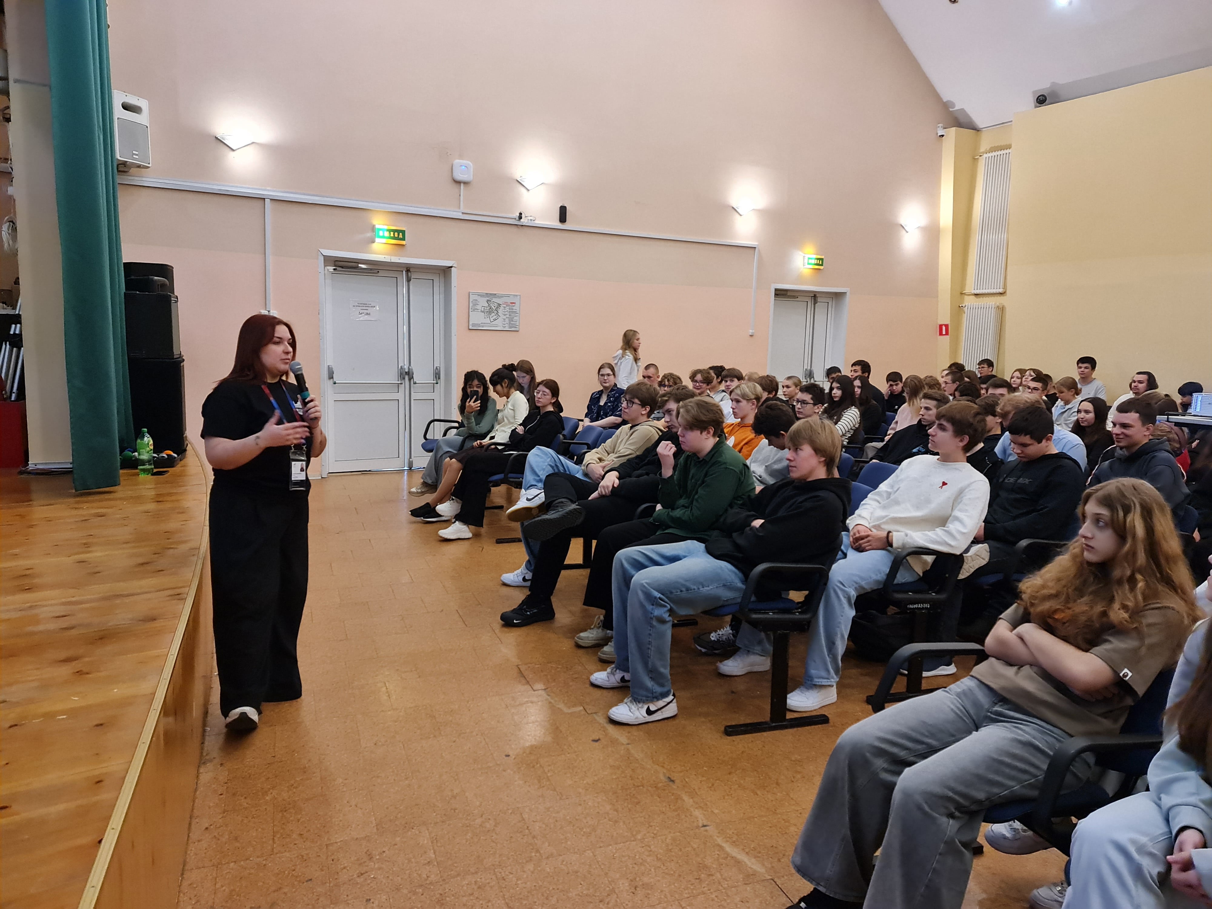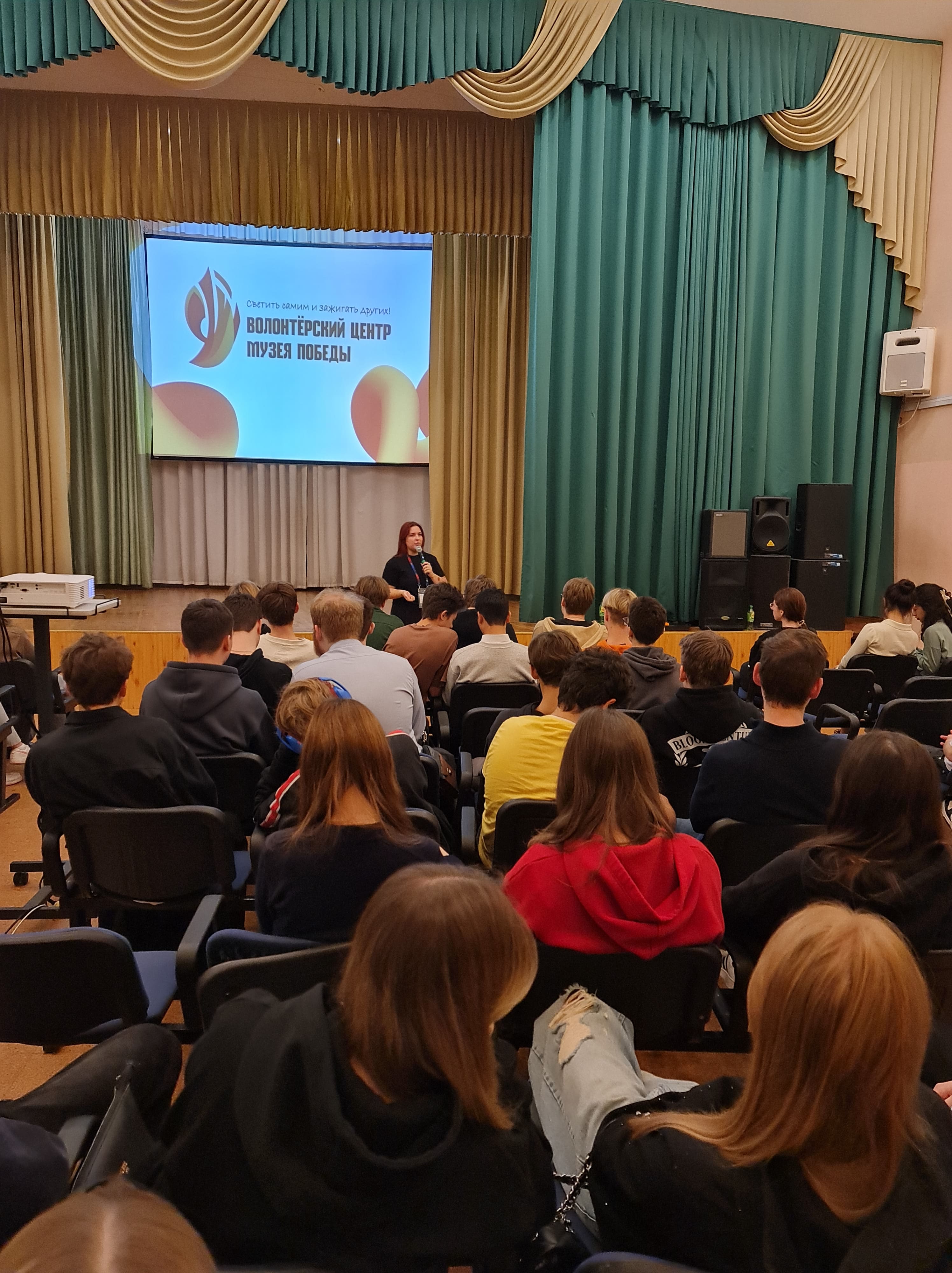 21 октября 2025 года в школе прошла встреча старшеклассников с руководителем волонтерского центра Музея Победы на Поклонной горе Ульяной Николаевной Брагичевой. Главной целью встречи было знакомство ребят с историей волонтёрского движения музея Победы и деятельностью современных волонтерских организаций, формирование активной жизненной позиции у ребят, воспитание чувства патриотизма и гражданской ответственности. А также вырабатывание таких качеств как доброта, милосердие, отзывчивость, способность к состраданию, желание помогать другим людям, участвовать в полезной для общества деятельности.