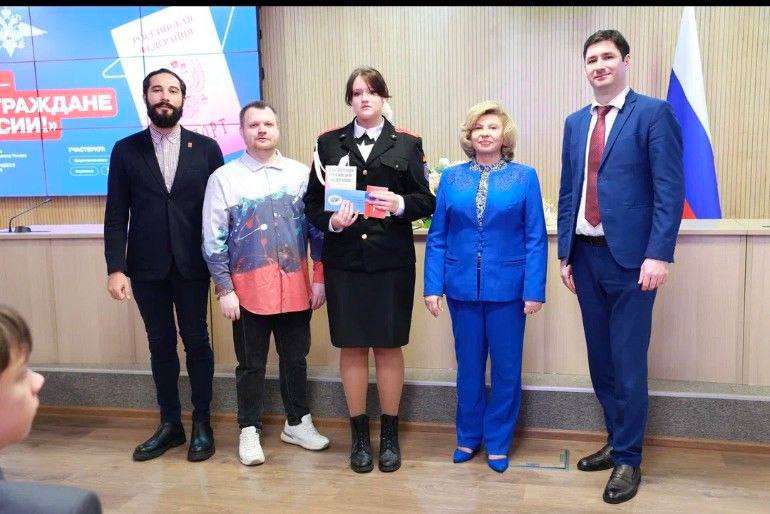 Одна из самых символичных церемоний прошла в Доме прав человека. Среди 40 счастливчиков, которым паспорт вручили лично Уполномоченный по правам человека в РФ Татьяна Николаевна Москалькова и представители Молодежного совета, была и наша ученица — Алина, активистка Движения Первых, ученица 8 «К» класса.
